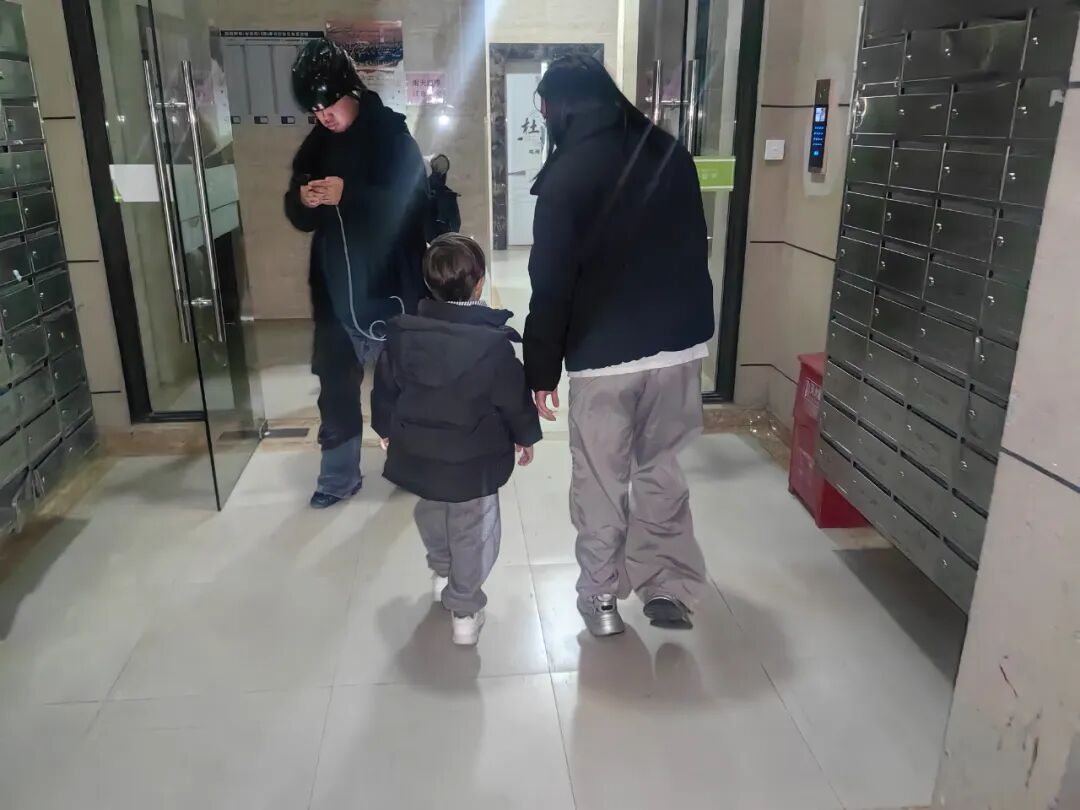 几人带着孩子一边往小区方向过去