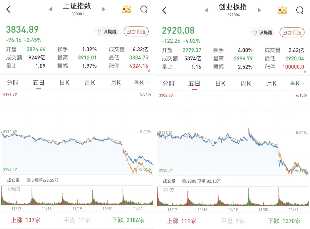 A股三大股指11月21日集体低开,沪指直接跌破3900点。早盘快速下跌,午前跌幅略有收窄。午后短时震荡后重返跌势,尾盘更是跌幅扩大。